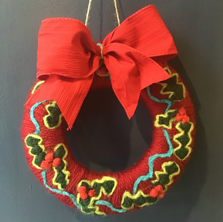 Chunky wool indoor Christmas wreath in red green and baby blue. Ideal for cosy Christmas decor to bring the joy in your home