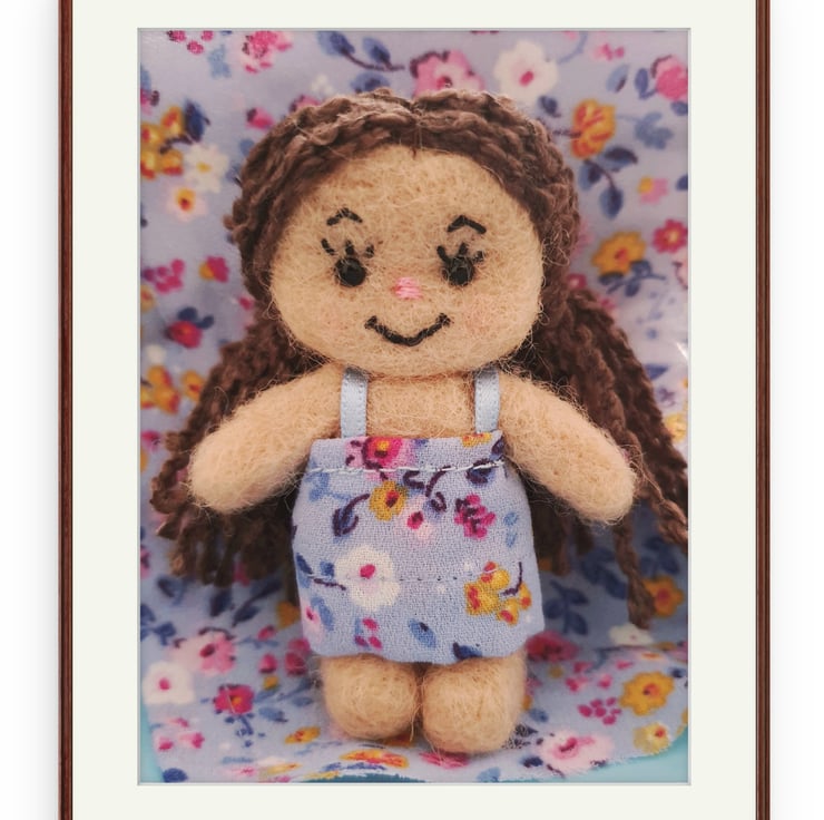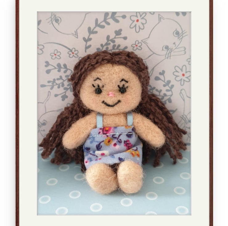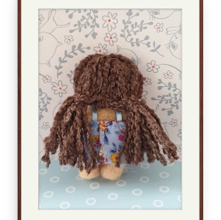 I have always loved rag dolls and I wanted to create a mini one made entirely from wool. I bought a lovely curly arran wool for her hair and crafted her entirely by needle felting. Her mini size means she fits in easily with any display or even as a traveling companion (part of the reason for the name I give my teds and characters)