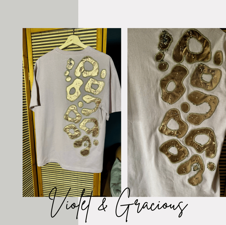 Our Oversized Tee's are made from soft, thick Polyester Cotton. These beautiful T-shirts are all individual - each one is limited edition. This gorgeous tee features metallic leopard print which is finished with hand beading. Create the perfect 90's feel with our joggers or add your favourite baggy jeans and trainers. Also perfect for lounging.