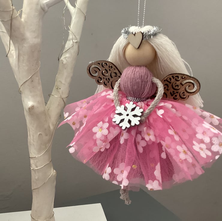 I have created her hair and dress using 100% recycled macrame cotton brushed through to make a luxurious fringe . Her glittery skirt is made from sequined tulle and she holds a white snowflake in her hands. Completed with her magical fairy wings and silver halo she is ready to adorn your Xmas tree from the hanging thread or to gift as a Keepsake to that special person.