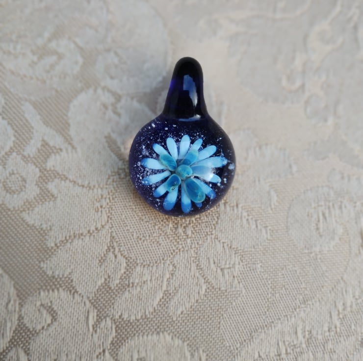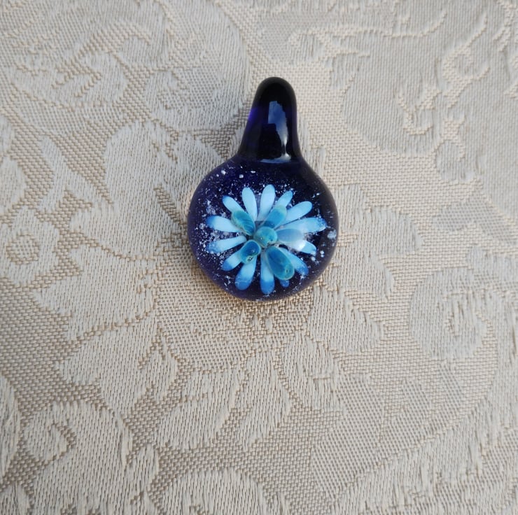 This exquisite pendant features a captivating flower implosion design, where delicate layers of baby blue and deep cobalt glass swirl together in an intricate display of artistry and colour. The central flower motif is created using a stunning technique that forms a three-dimensional, floral shape within the glass, giving it depth and movement. The soft baby blue tones gently blend into the rich cobalt hues, and sparkle background creating a harmonious contrast that is both soothing and striking. Comes with a black thong and gift box. 2cm wide x 3cm long (inc bail).
