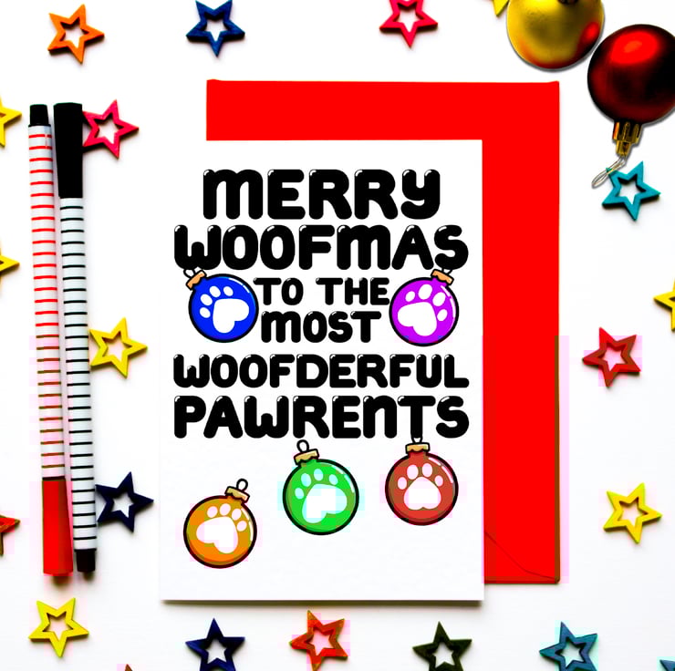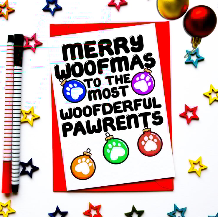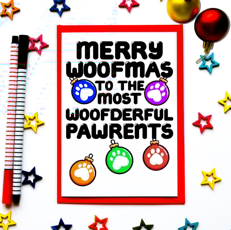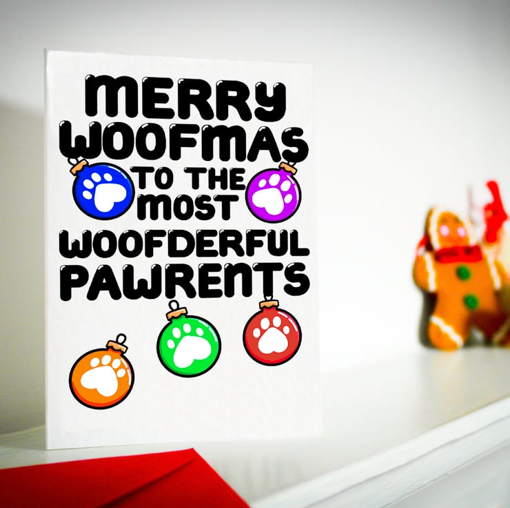 Greeting on front: MERRY WOOFMAS TO THE MOST WOOFMAS PAWRENTS