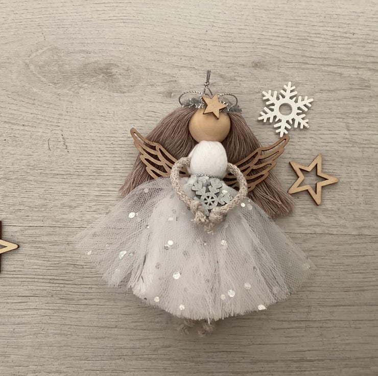 I have created her hair and dress using 100% recycled macrame cotton brushed through to make a luxurious fringe . Her glittery skirt is made from sequined white tulle and she holds a white snowflake in her hands. Completed with her magical fairy wings and silver halo she is ready to adorn your Xmas tree from the hanging thread or to gift as a Keepsake to that special person.