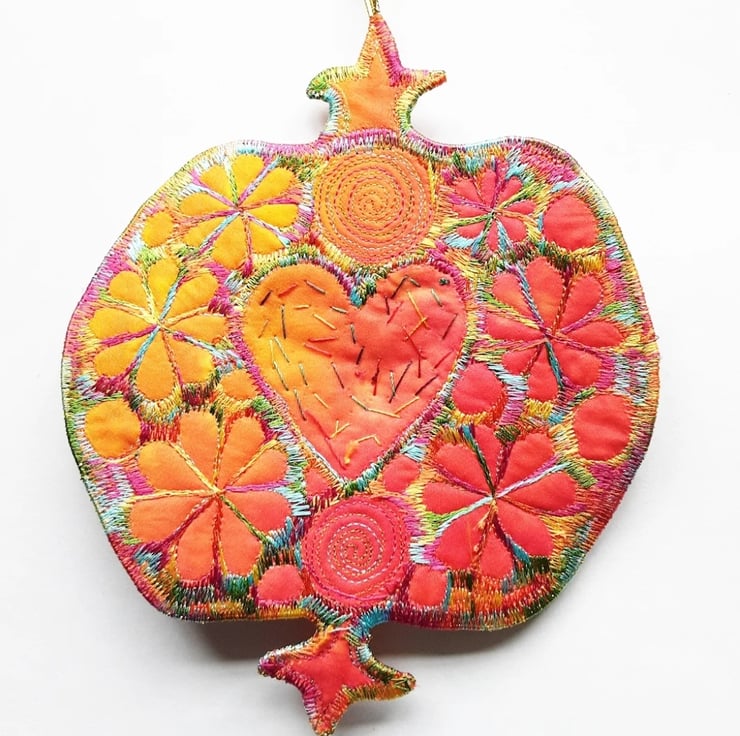 This is a handmade pomegranate hanging decoration. The heart shape in the middle is decorated with beads to represent the seeds.