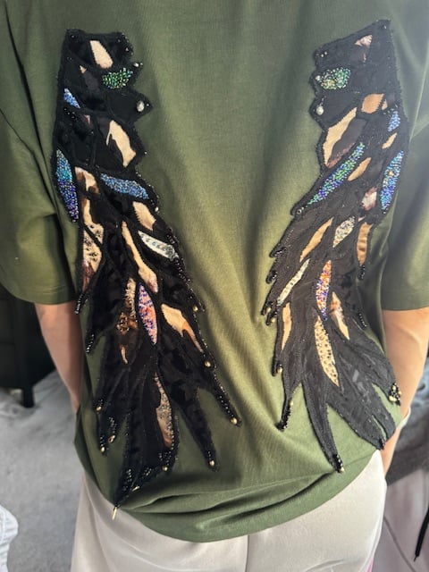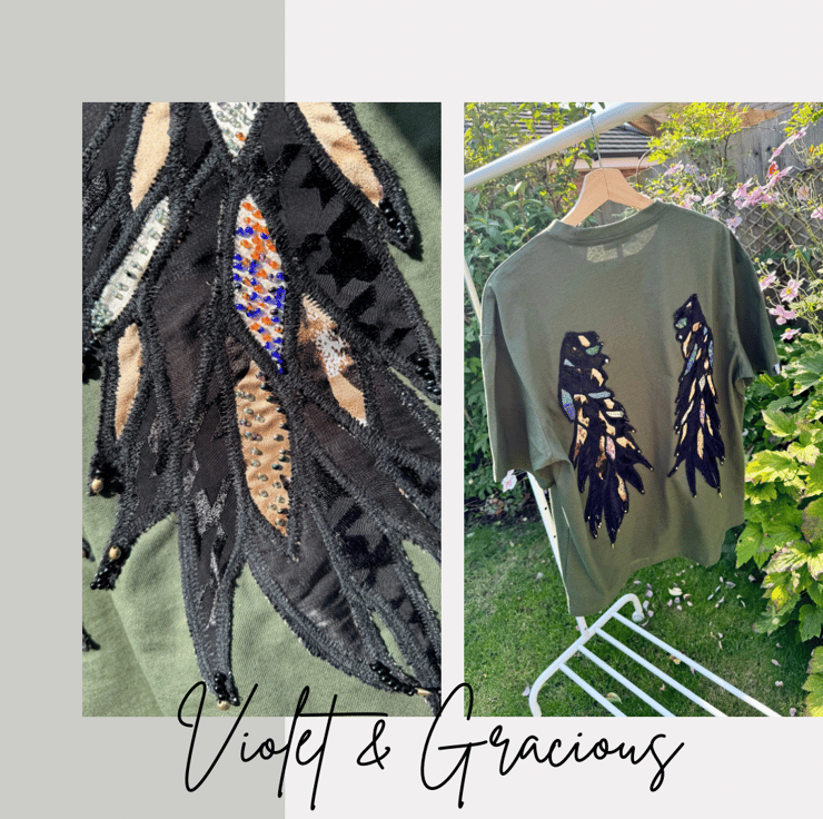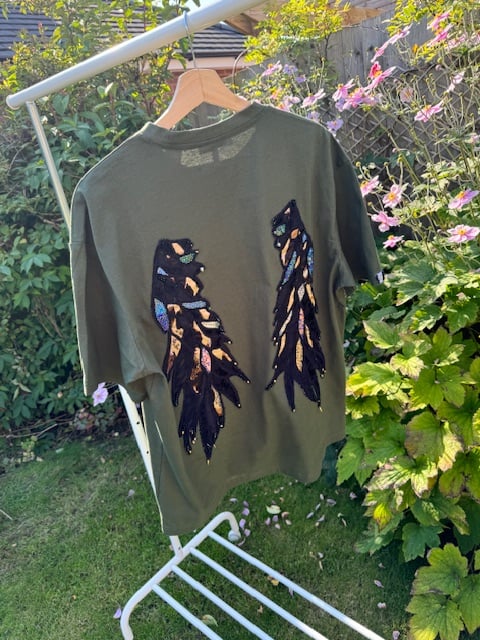 Our Oversized Tee's are made from soft, thick Polyester Cotton. These beautiful T-shirts are all individual - each one is limited edition. This gorgeous tee features reverse appliqué angel wings which are finished with hand beading. Create the perfect 90's feel with our joggers or add your favourite baggy jeans and trainers for a casual Sunday look. Also perfect for lounging.