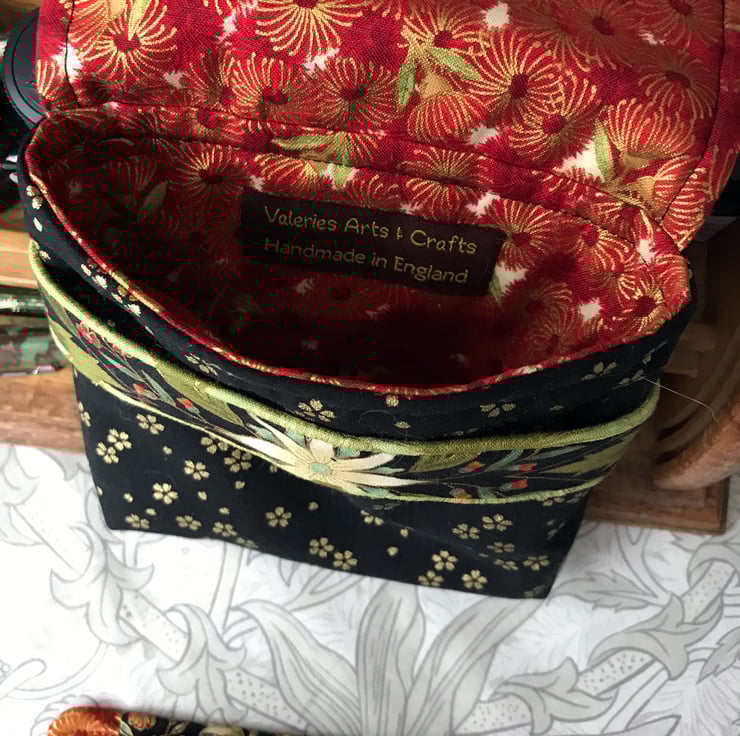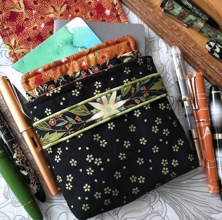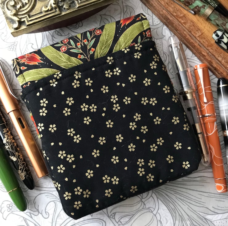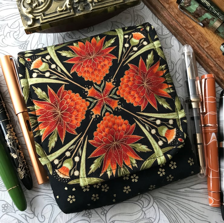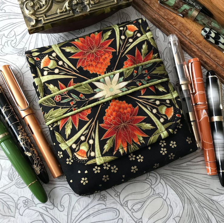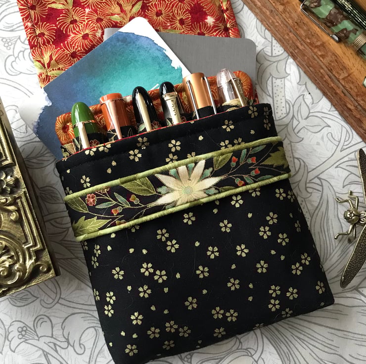 The outer, padded case contains a removable stiffened insert with fabric loops to hold, separate and protect the pens. All visible fabrics are 100% cotton. Three types of interlining provide cushioning, support and stability. The pen slots are 10 cm long so give excellent protection and will house all but the chunkiest of pens, while the tuck-under outer flap adjusts to accommodate extra-long pens. There is space behind the insert in which to tuck a note of pens and inks, plus a small notebook, or even a few more pens! Only a very limited number of each case will be made.