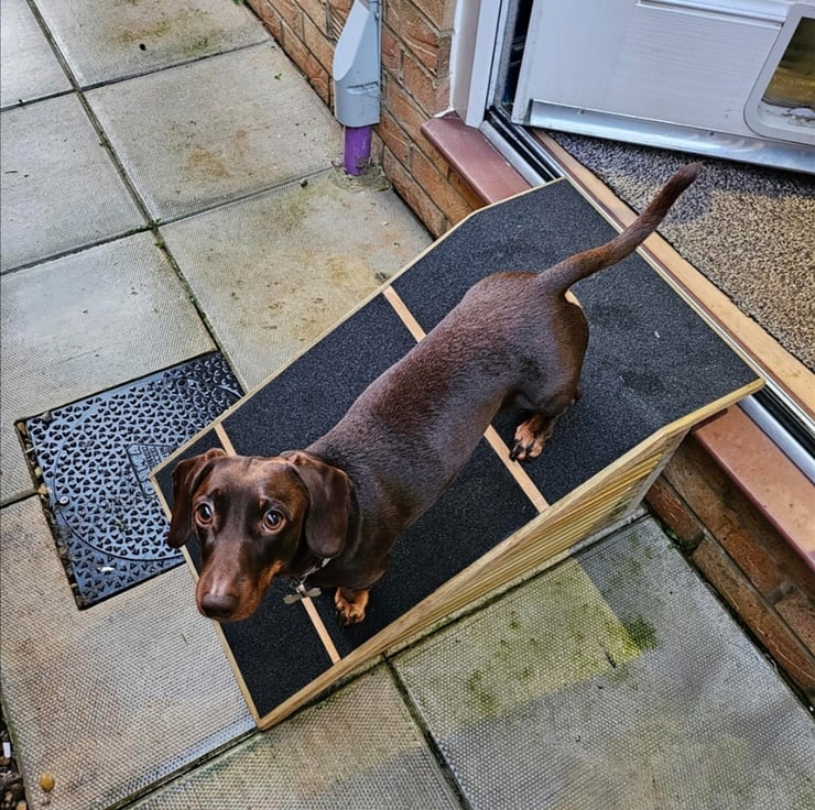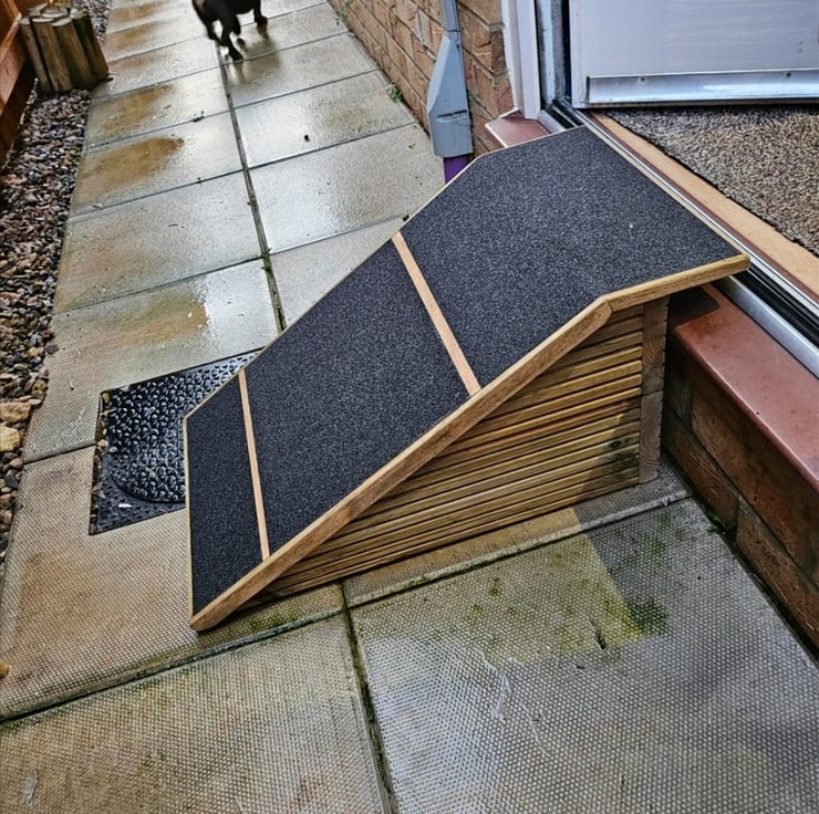 Having made outside pet ramps and indoor sofa/bed ramps for many years I was contacted by a previous customer who had just had installed some patio doors, including a dog flap inset in the glass but it was too high for the little dog to use. I designed this type of ramp to give easy through access in/out of the house without the owner being present.