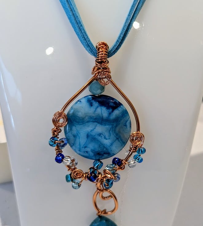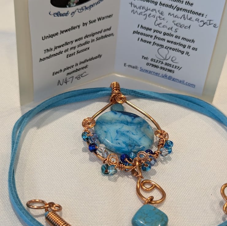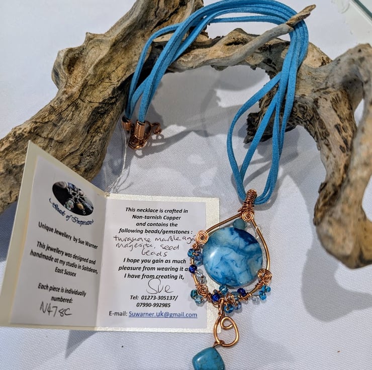 Turquoise Marble Agate measuring 3 cms (1.25 ins) suspended from a Non-tarnish Pendant, decorated with seed beads in various shades of blue, and a hanging diamond magesite bead. The pendant measures 6 cms (2.5 ins). The hanging magesite adds 3.5 cms (1.5 ins) to the length. The turquoise faux swede thong measures 48 cms (19 ins). The Turquoise Marble Agate is a beautiful stone reminiscent of the sky. This piece would make a wonderful reasonably priced present. It is unique, individually numbered and will arrive iin a beautiful and unusual organza bag