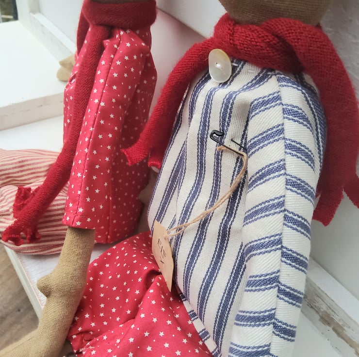 He is made from coffee and cinnamon dyed Osnaburg fabric, sanded back for an aged look. His features are embroidered. His clothing is all cotton fabrics.
