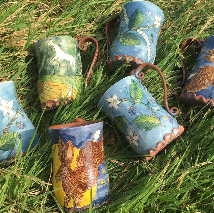 Each earthenware piece is hand carved and then painted using underglazes I blend myself, before being inlaid with oxide washes and finally glaze fired. The theme of each motif continues to the underside, which is textured with custom made rollers and impression tools.