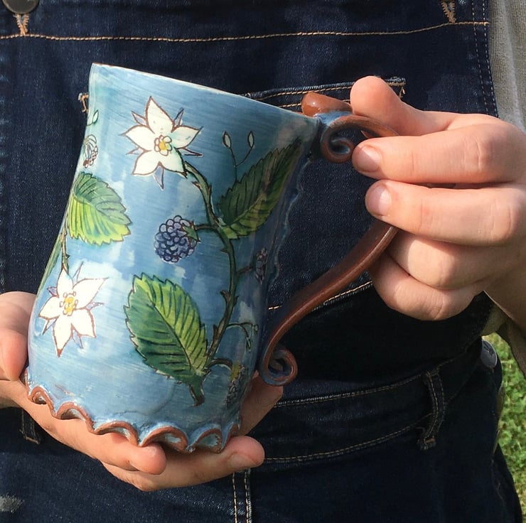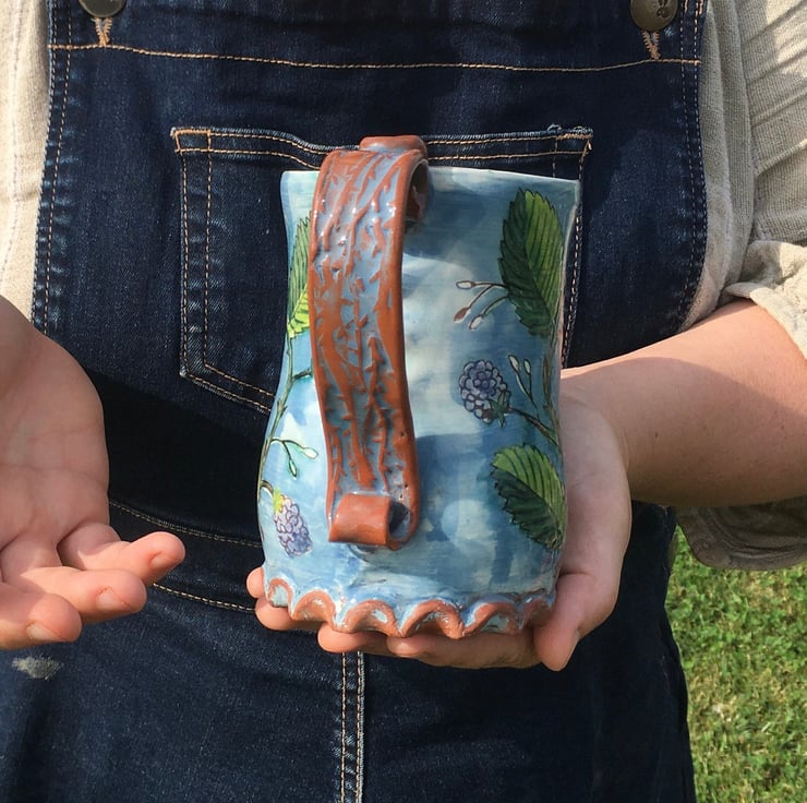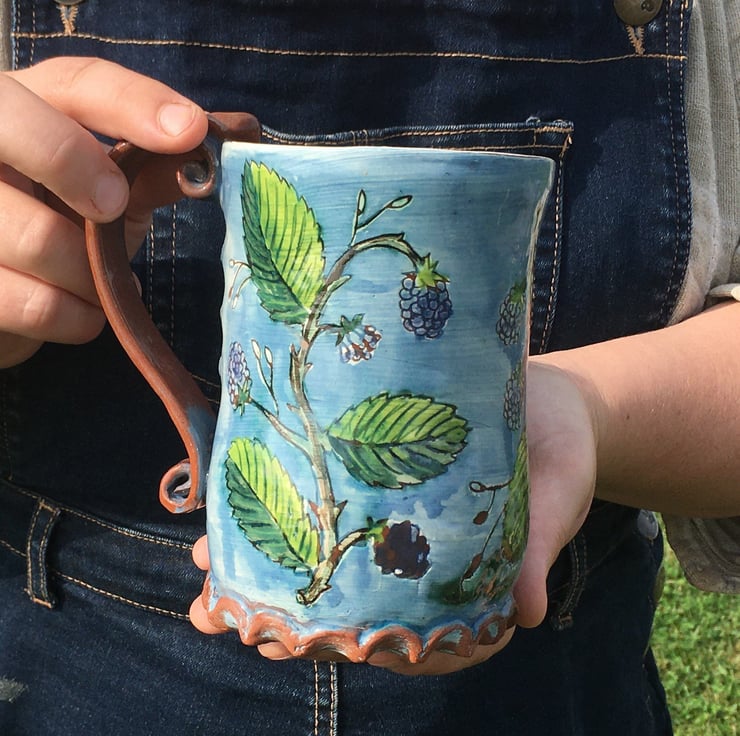 Prickly brambles with sweet berries twine round the curves of this summer blue pottery tankard. Holds just over a pint.