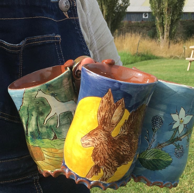 Each earthenware piece is hand carved and then painted using underglazes I blend myself, before being inlaid with oxide washes and finally glaze fired. The theme of each motif continues to the underside, which is textured with custom made rollers and impression tools.