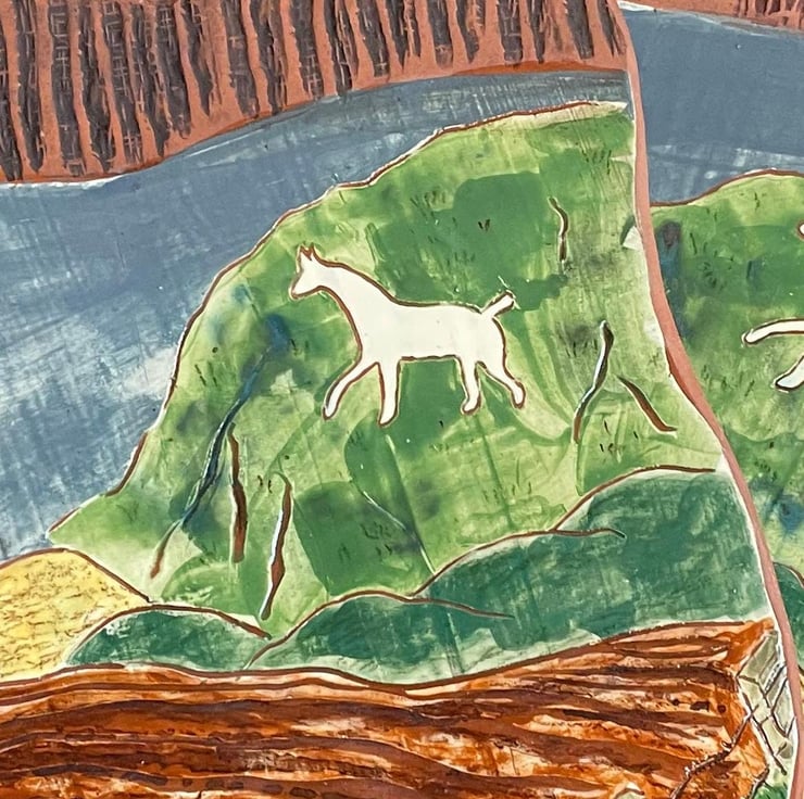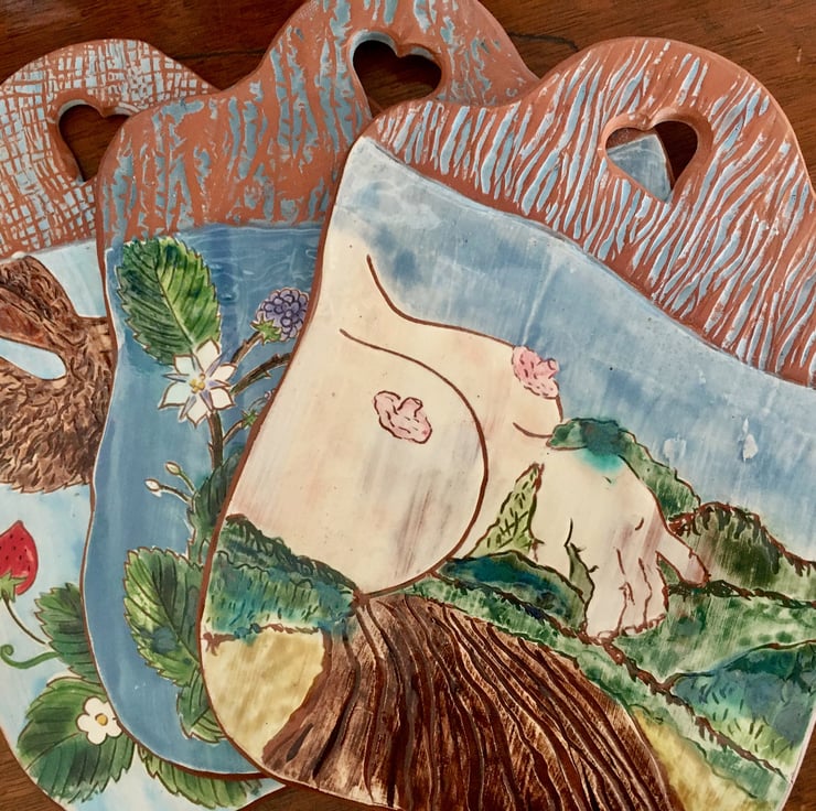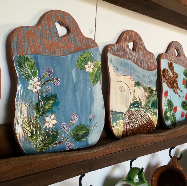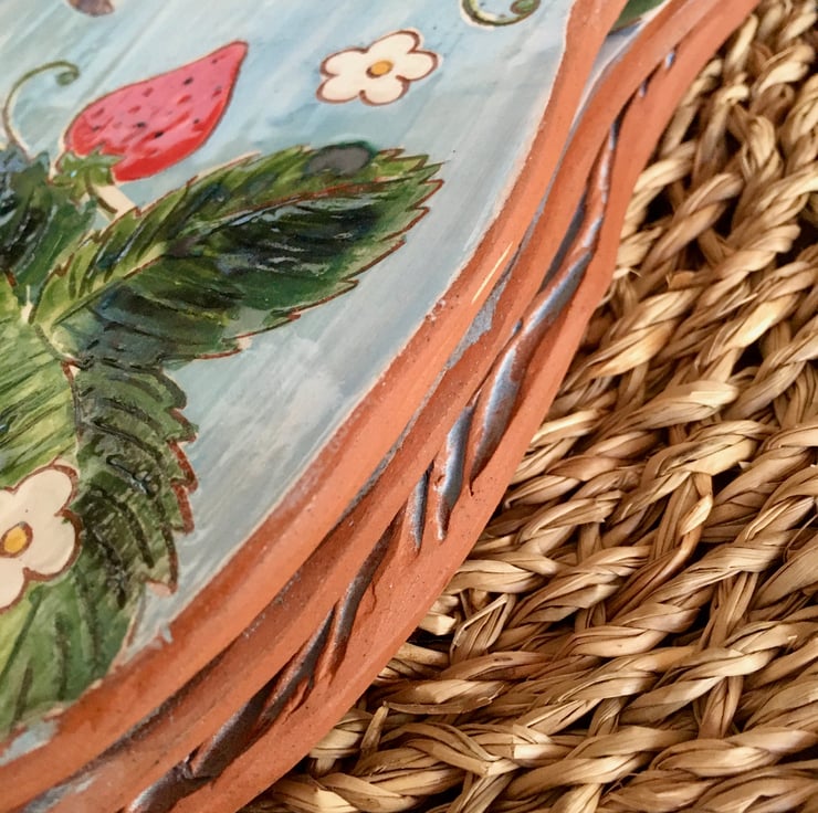 Measuring, approx 26cm long and 19 cm wide, my terra cotta earthenware picture dishes bear motifs of whimsy, cycles, and the Wiltshire countryside around me. Each one is hand carved and then painted, before being inlaid with oxide washes and finally glaze fired. The theme of each motif continues to the reverse, which is textured with custom made rollers and impression tools.