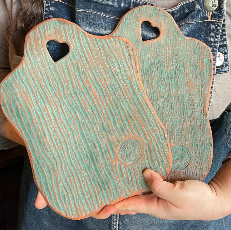 Measuring, approx 26cm long and 19 cm wide, my terra cotta earthenware picture dishes bear motifs of whimsy, cycles, and the Wiltshire countryside around me. Each one is hand carved and then painted, before being inlaid with oxide washes and finally glaze fired. The theme of each motif continues to the reverse, which is textured with custom made rollers and impression tools.
