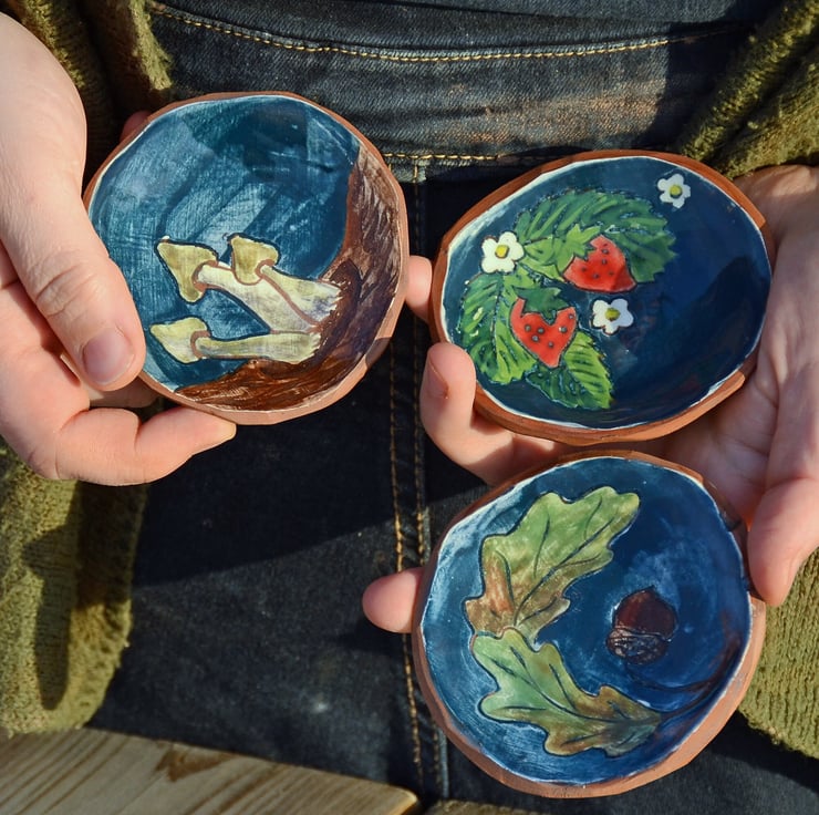 Measuring, just under 9 cm across, these terra cotta earthenware picture plates bear motifs of nature, cycles, life and death. Each one is hand carved and then painted, before being inlaid with oxide washes and finally glaze fired. The theme of each motif continues to the reverse, which is textured with custom made rollers and impression tools.