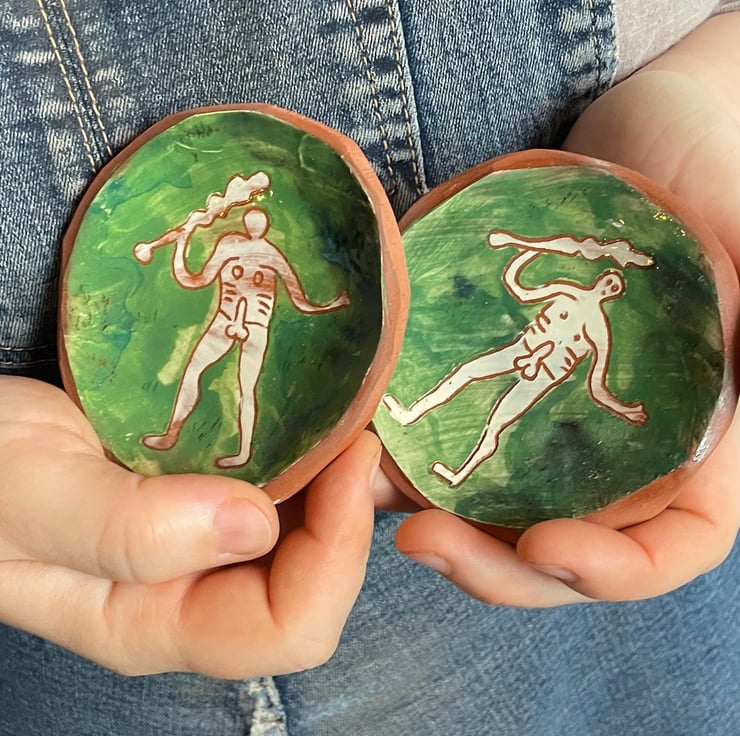 Curved sherds of earthenware scaled to nestle in your palm - this little dish features the famous chalk figure giant of Cerne Abbas.