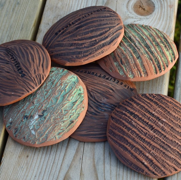 Measuring, just under 9 cm across, these terra cotta earthenware picture plates bear motifs of nature, cycles, life and death. Each one is hand carved and then painted, before being inlaid with oxide washes and finally glaze fired. The theme of each motif continues to the reverse, which is textured with custom made rollers and impression tools.