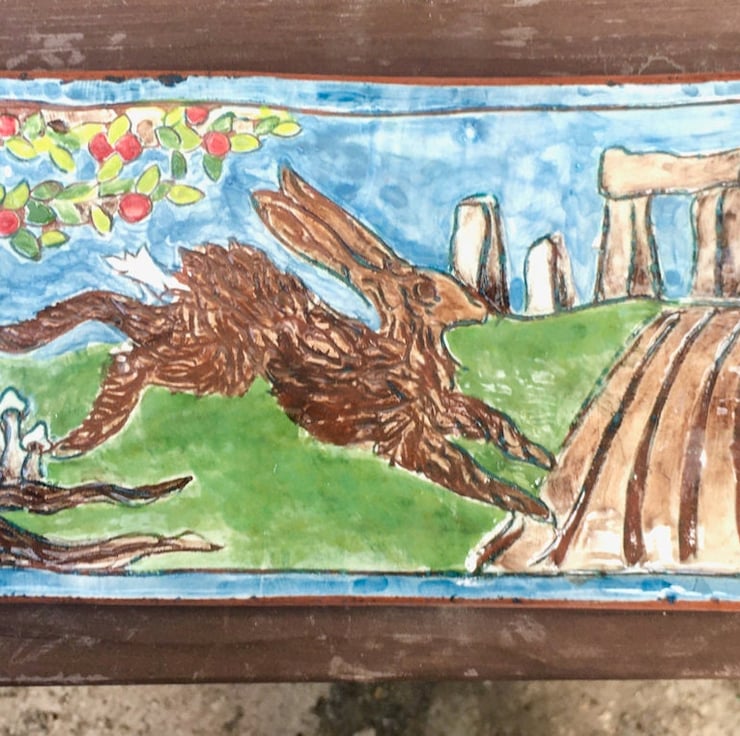 A sgraffito and handpainted glazed terracotta tile - makes a fine trivet, plate or a lovely wall hanging.