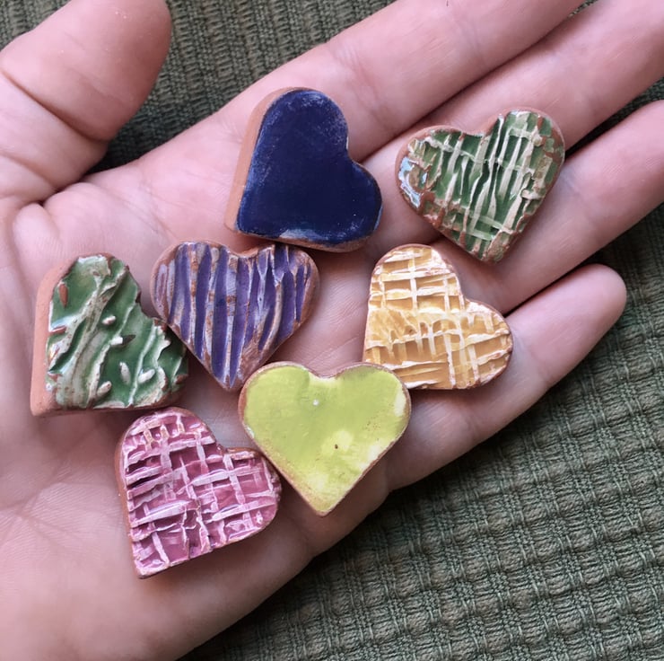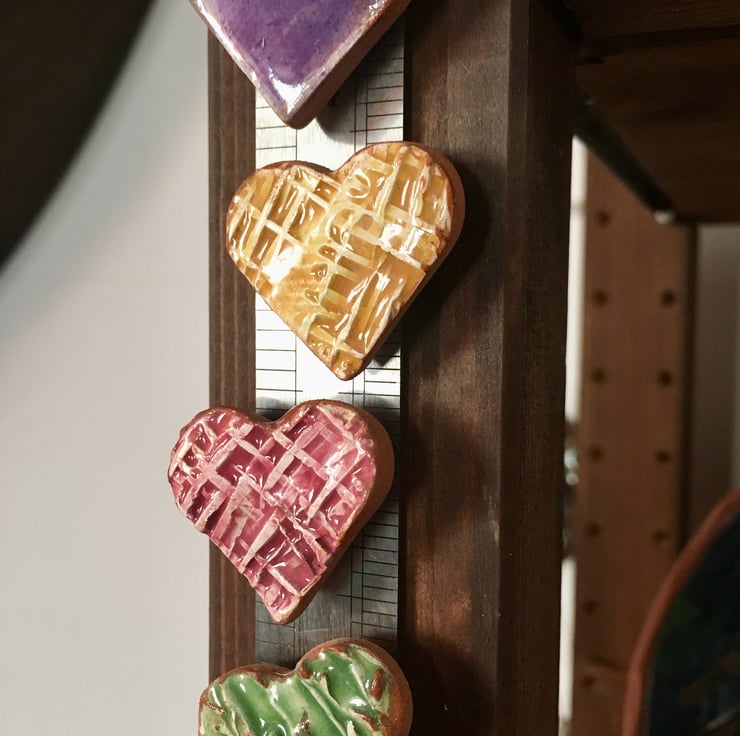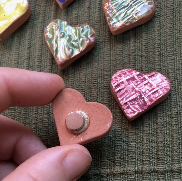 Made from terra cotta earthenware, textured with my own custom roller stamps, and painted in bright underglazes. Then, glazed in clear before having a super strong little neodymium magnet affixed to the back - these little guys are perfect for a photo or memory board, the fridge, anywhere ferrous you'd like to post a note or hang a message.