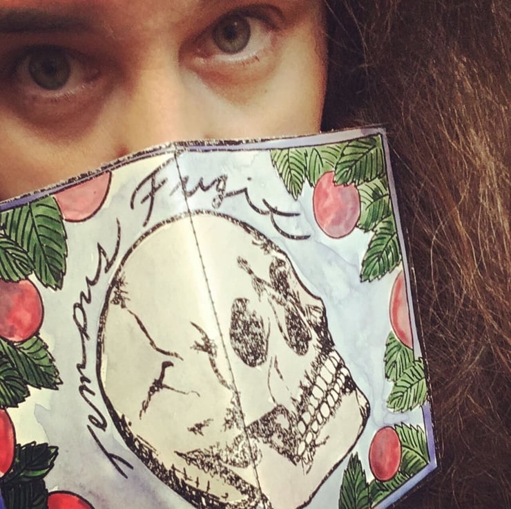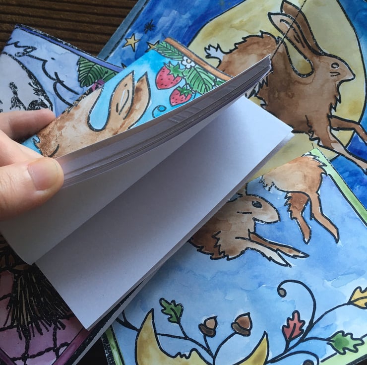 Each image is printed on heavy card and painted in with vivid gouache colours before being stitched onto 30 white paper pages.