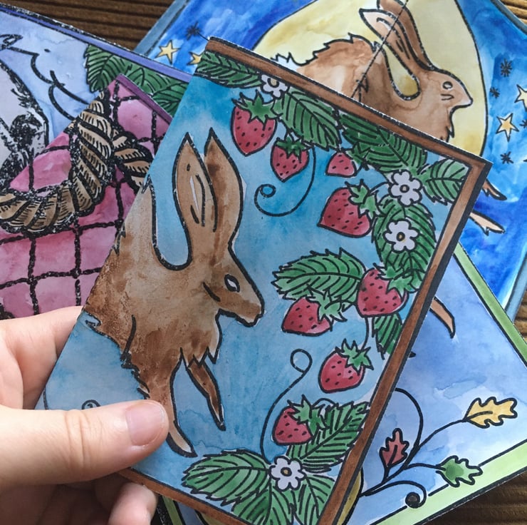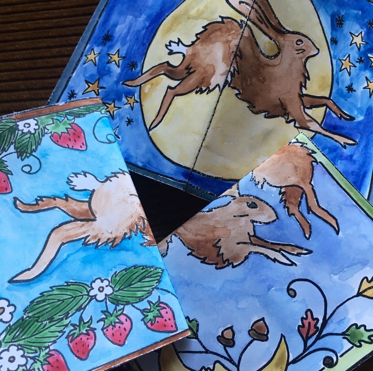 You will get a lucky dip of 3 different notebooks from the evolving collection: scenes from a world where rabbits frolic, strawberries are always ripe, mushrooms tickle tree bark and stones stand.