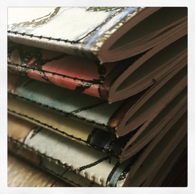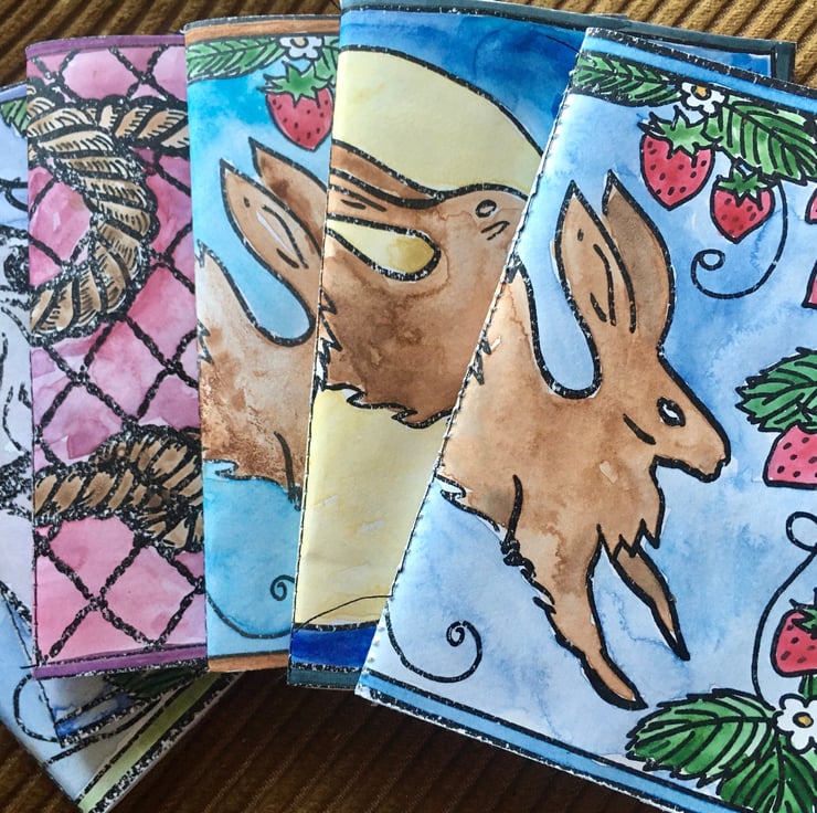 Referencing flora, fauna and scenes of featured on my pots - these little notebooks are hand coloured, stitched and trimmed. They fit nicely in an apron pocket next to a pencil stub, ready to receive your notes, passing fancies, sudden inspirations... er, grocery lists.