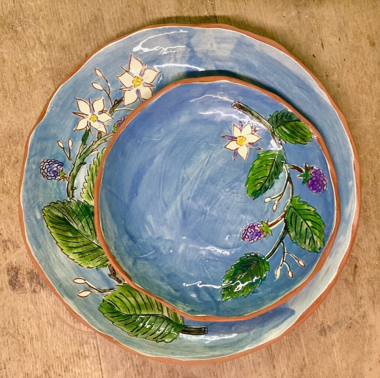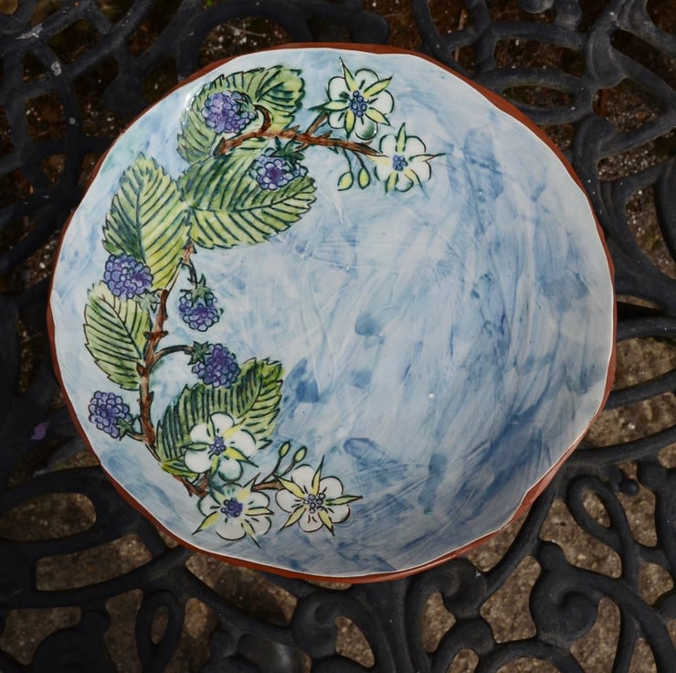 Curved sherds of earthenware to enliven your meal - this brambley dish, redolent of blackberries and summer skies, is sure to sweeten your palate.
