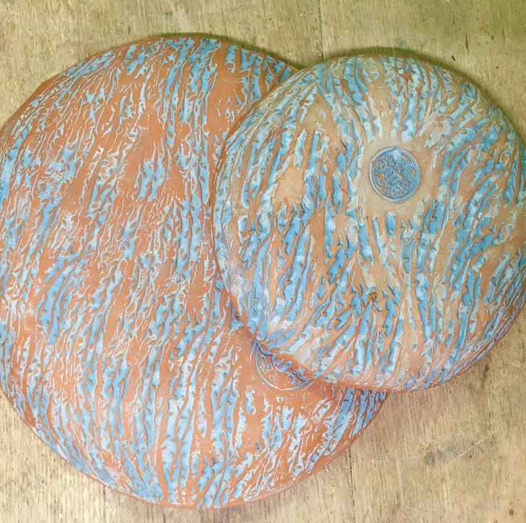 Measuring, approx 10 inches (26cm) across and 1.5 in (3 cm) deep, my terra cotta earthenware picture plates bear motifs of nature, cycles, life and death. Each one is hand carved and then painted, before being inlaid with oxide washes and finally glaze fired. The theme of each motif continues to the reverse, which is textured with custom made rollers and impression tools.