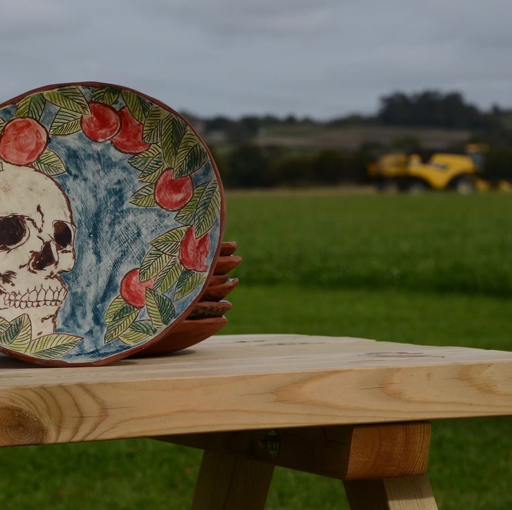 Curved sherds of earthenware to enliven your meal - this skull and apples dish is a reminder to enjoy every moment, every bite, since tomorrow...