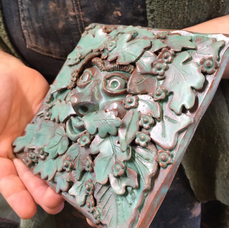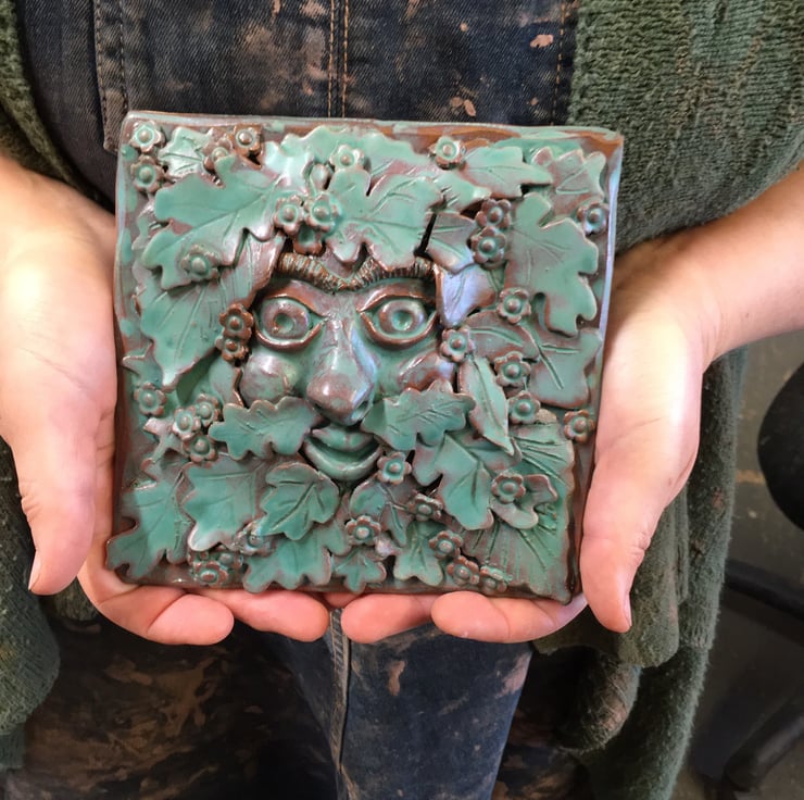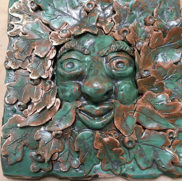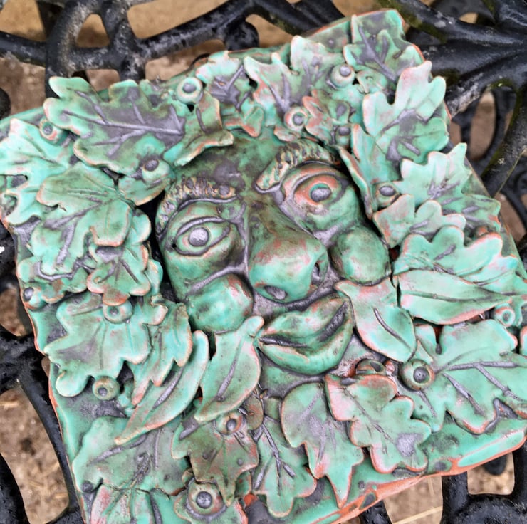A decorative figure for wall or garden, these verdant Green Man dimensional wall tiles are sculpted leaf by leaf - each one is uniquely berried or flowered, to charm your living or outdoor space.