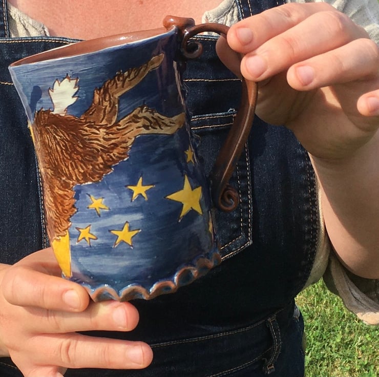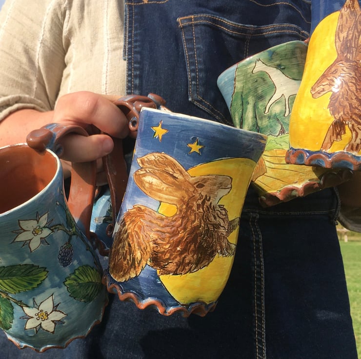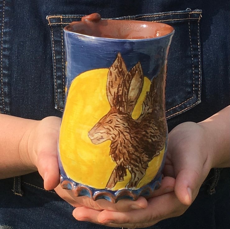 A wild hare leaps across a starscape and a fat full moon on this curvy midnight blue pottery tankard. Holds just over a pint.