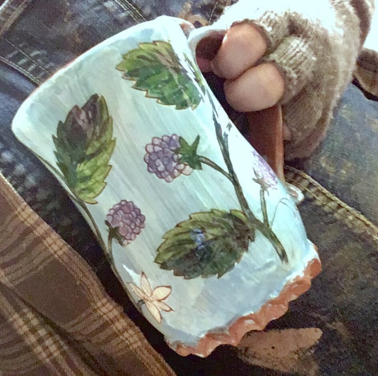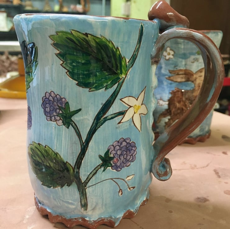 Ripe summer blackberry canes adorn this curvy light blue pottery tankard. Holds just over a pint.