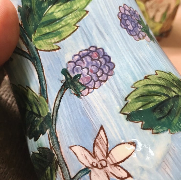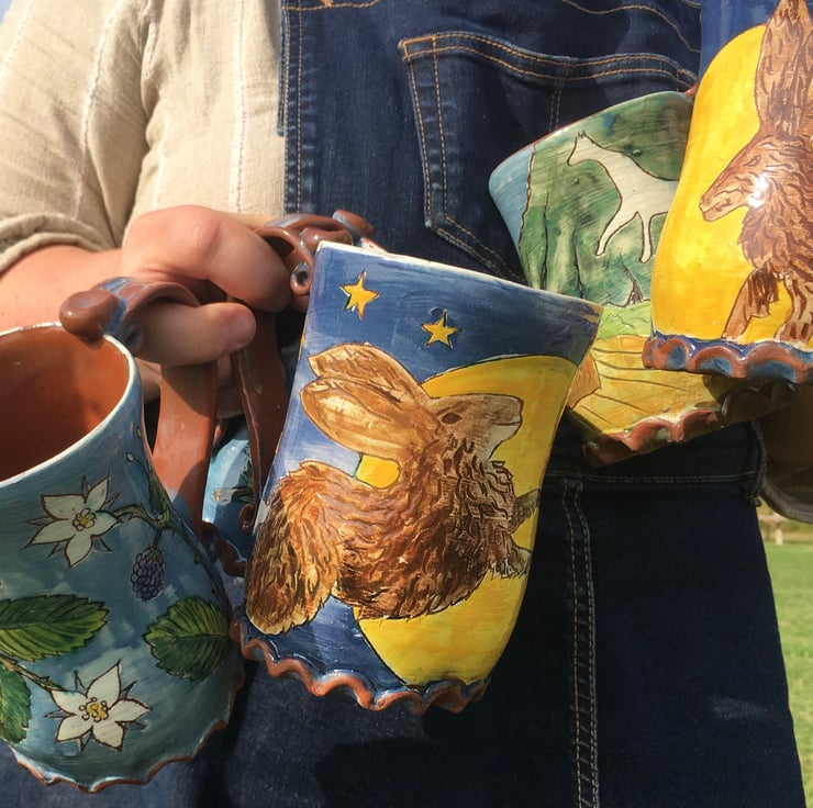 Each earthenware piece is hand carved and then painted using underglazes I blend myself, before being inlaid with oxide washes and finally glaze fired. The theme of each motif continues to the underside, which is textured with custom made rollers and impression tools.
