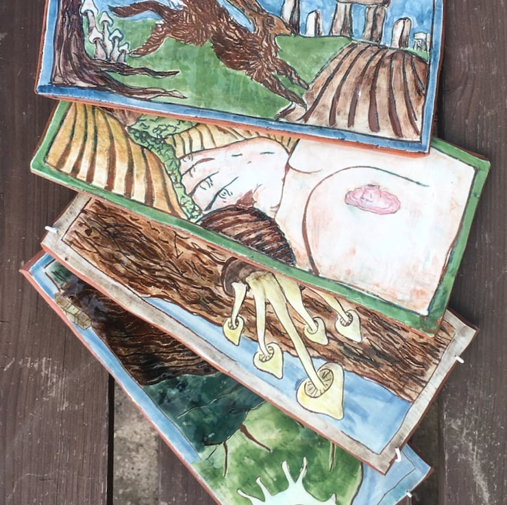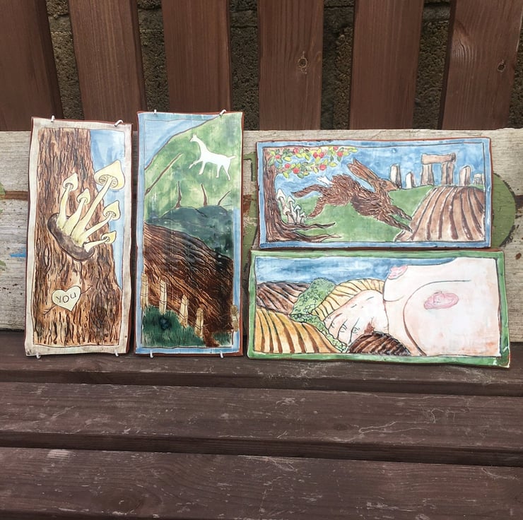 A carved and glazed terracotta tile featuring a goddess of rolling hills and fertile fields- makes a fine trivet, cheese plate, or a lovely wall hanging.