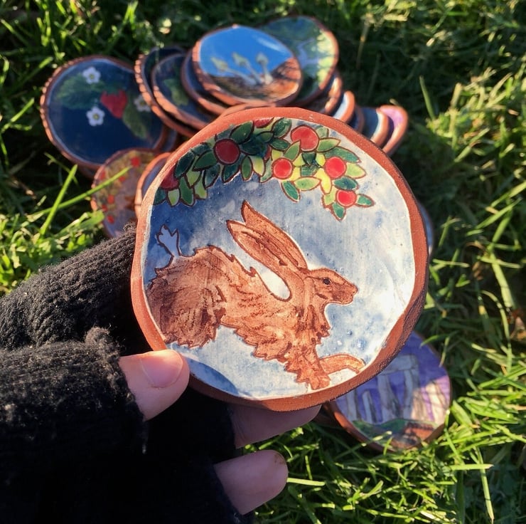 Curved sherds of earthenware to enliven your day - a this hare cavorts in an apple orchard, perhaps he's looking forward to some cider at harvest time! The reverse of this dish is impressed with textures, and inlaid with colour. It would make a fine home for your rings while you get on with the washing up, or a lovely plate for the biscuit to accompany your afternoon cuppa.