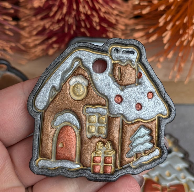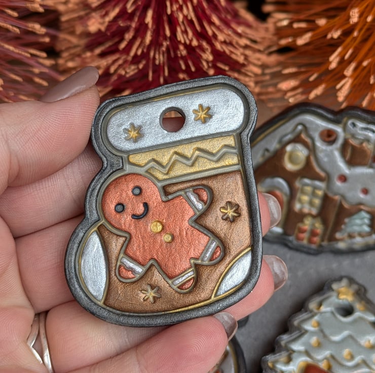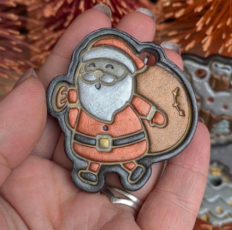 These are hand made decorations using air dry clay imprinted with Christmas deisgns and painted using lovely acrylic paints in obscure metallic colours. They have been sealed with a gloss either side for a lovely finish and protection.