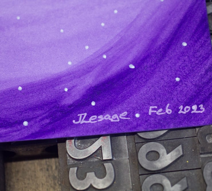 This limited edition print is produced using letterpress on A3 size acid-free heavy 300gsm Seawhite Cartridge paper which I have then individually hand-painted with a violet watercolour galaxy, white gouache stars and a miniature Starship Enterprise. PLEASE NOTE that each print is individually hand finished making each piece a unique work of art with a high degree of variation which means it will probably not be exactly like the one in the photograph.