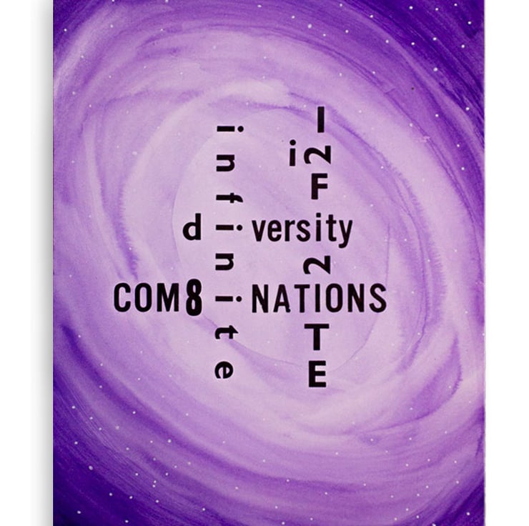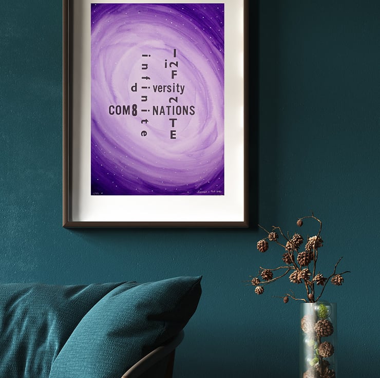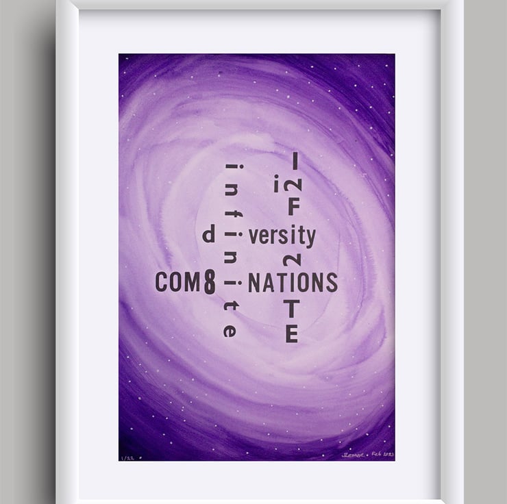 This print started out as an idea for a card for my daughter's 22nd birthday, which instead became a limited edition poster... This is why the number 22 is embedded in the poster, as is the infinity symbol which is linked with autism, and neurodiversity in general. My use of numbers also represents diversity of letterforms combining in creative and unexpected ways.
