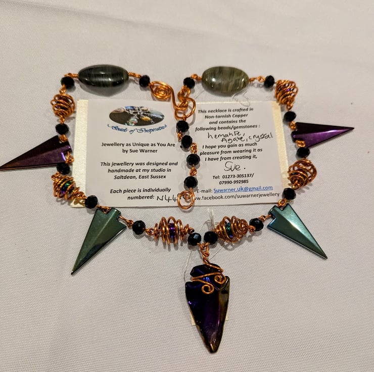 The hematite arrows were my inspiration for this necklace. I let them choose what to put with them. I like making caged beads and just seeing the colours of the hematite showing through. I particularly like the green and purple together as they compliment each other so well. Recentlhy my customers have been very drawn to hematite. I understand it is said to repel negativity, so maybe people are unconsciously drawn to it. The necklace would make a perfect present, Its unique and is numbered and will be delivered with a certificate of authenticity in a beautiful, unusual organza bag.