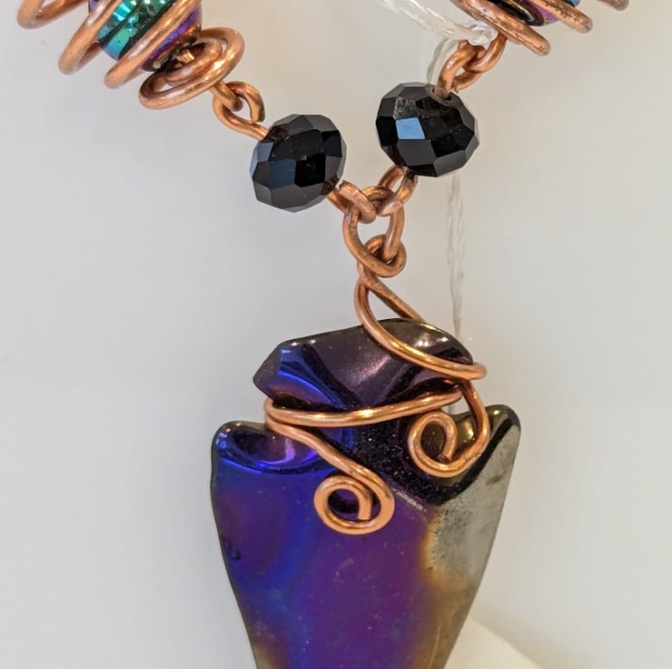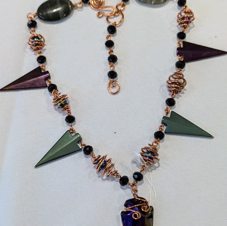 Non tarnisb copper enhanced with Green & Purple Hematite Arrows & caged beads enhanced by Black Chinese Crystal and green Agate ovals. The length of the necklace is adjustable from 48 cms (19ins) to 54 cms (21 ins). An unusual necklace as the hematite beads are caged and the central arrow is wire wrapped., which is sure to draw a great deal of attention. It is unique, not to be repeated and is numbered.It will be delivered in a beautiful, unusually decorated organza bag and carry a certificate of authentication.