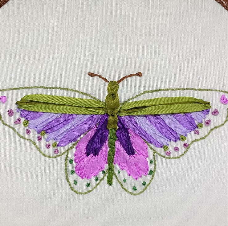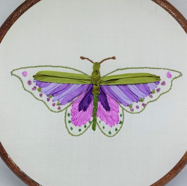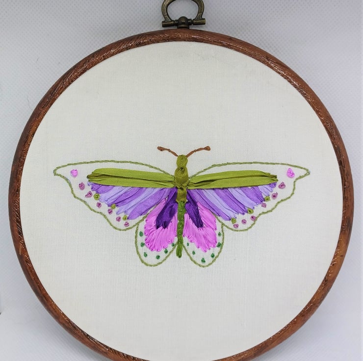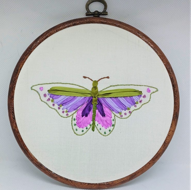This pretty butterfly is completely hand embroidered using silk ribbons in different sizes, and is framed in a 6 inch hoop.