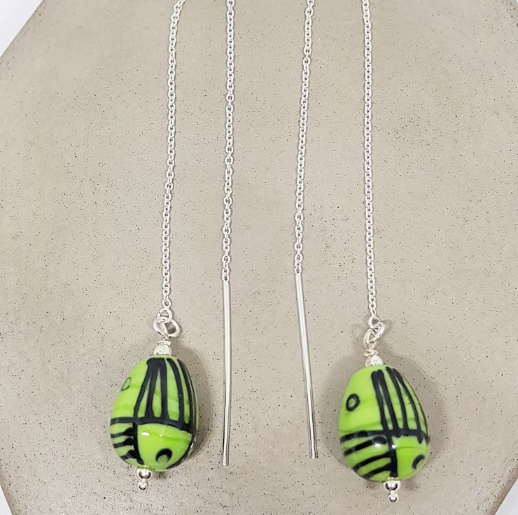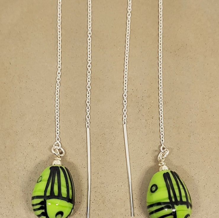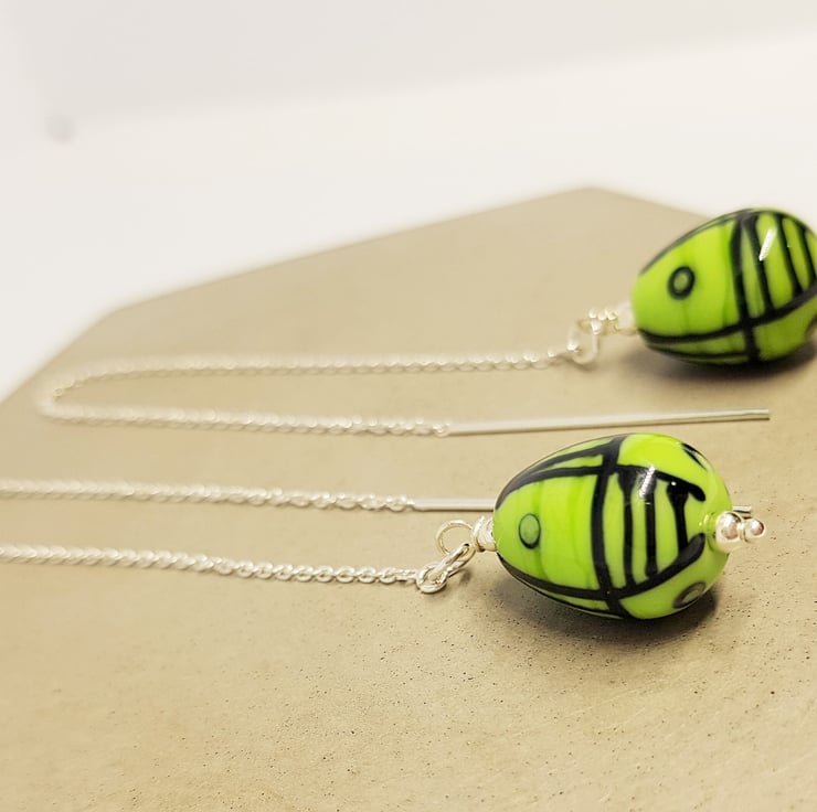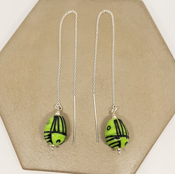 They feature lampwork glass egg shaped beads in a gorgeous lime green colour, with black geometric patterns