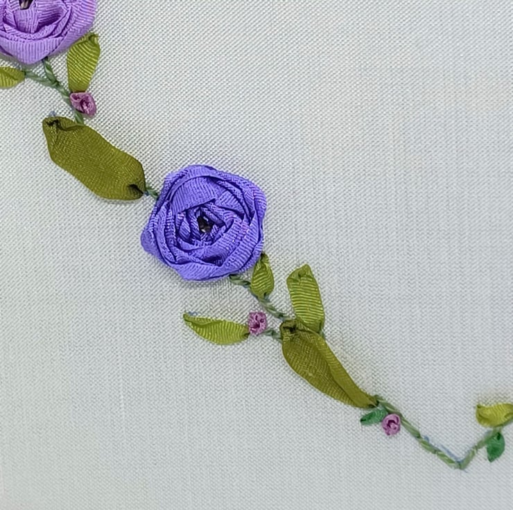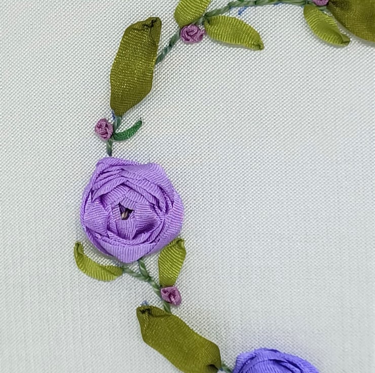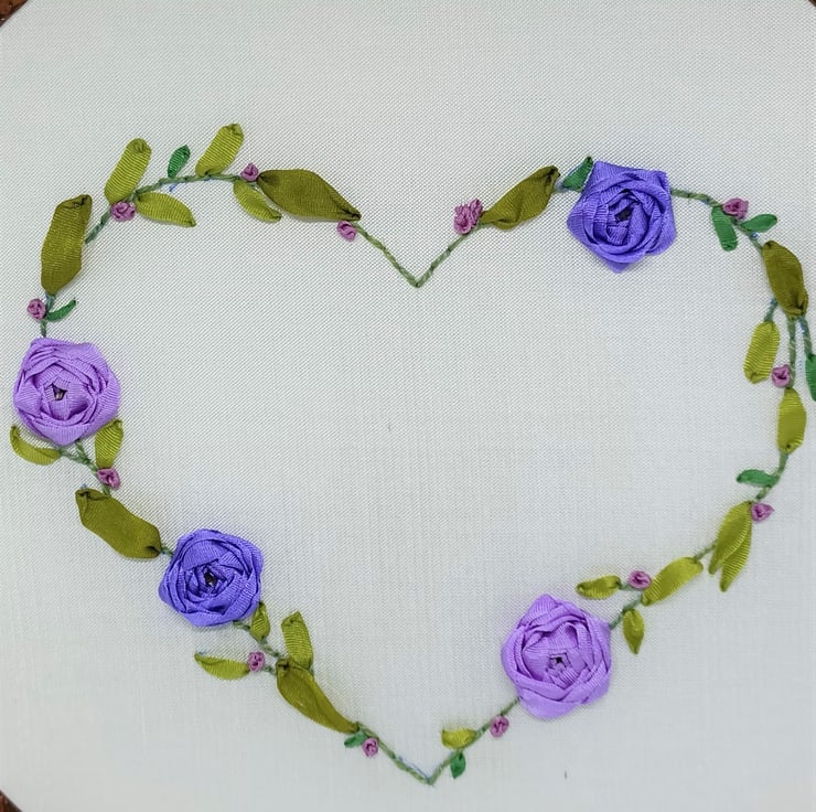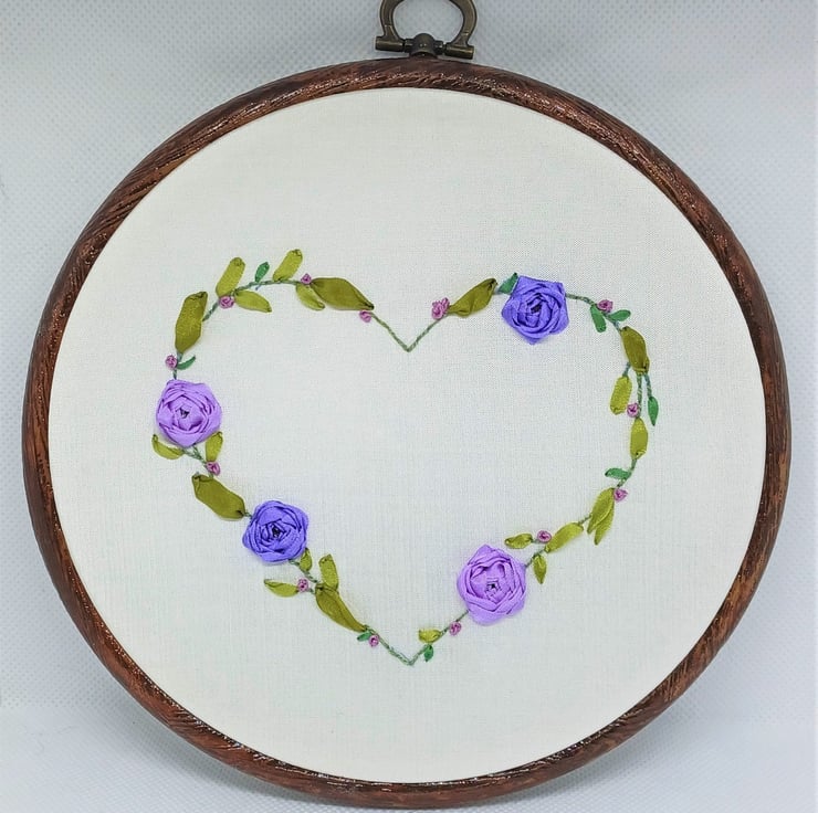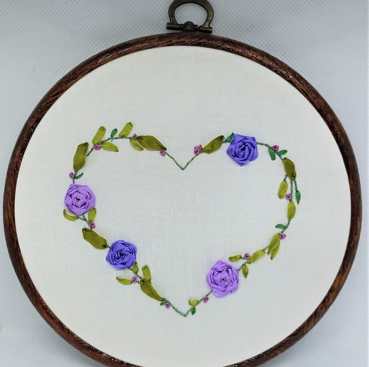 The purple ribbon roses wreath is completely hand embroidered using silk ribbons, on to a silk fabric base. The heart wreath is on a white silk base, and is framed in a 6 inch hoop.