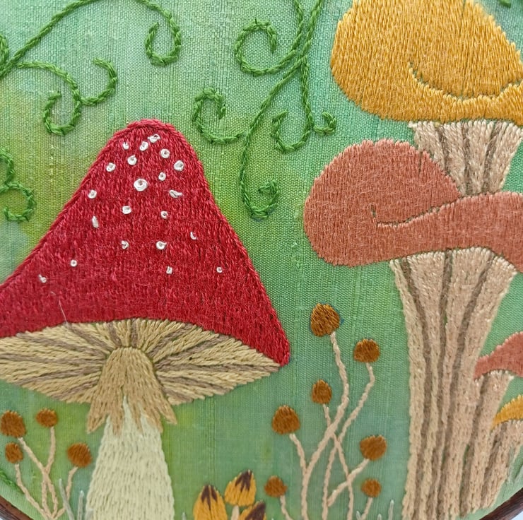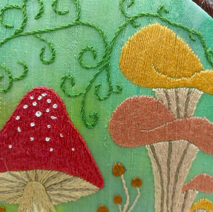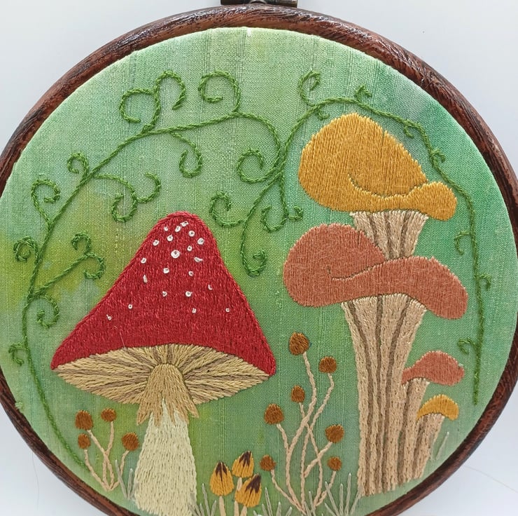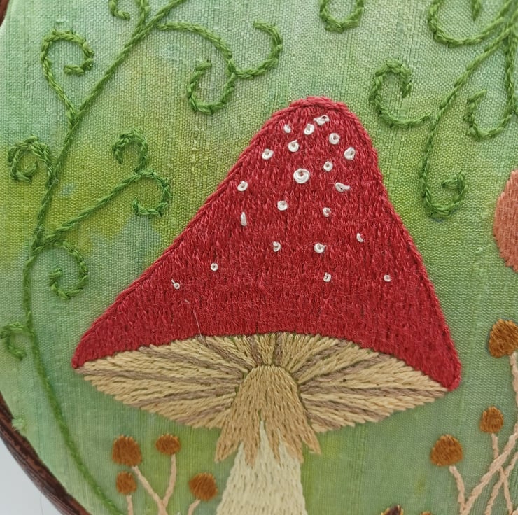 A multitude of different mushroomtoadstool designs hand stitched using silk threads on to a hand dyed silk base, this has lovely texture to the design. Framed in a 6 inch hoop.