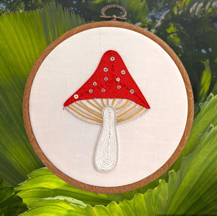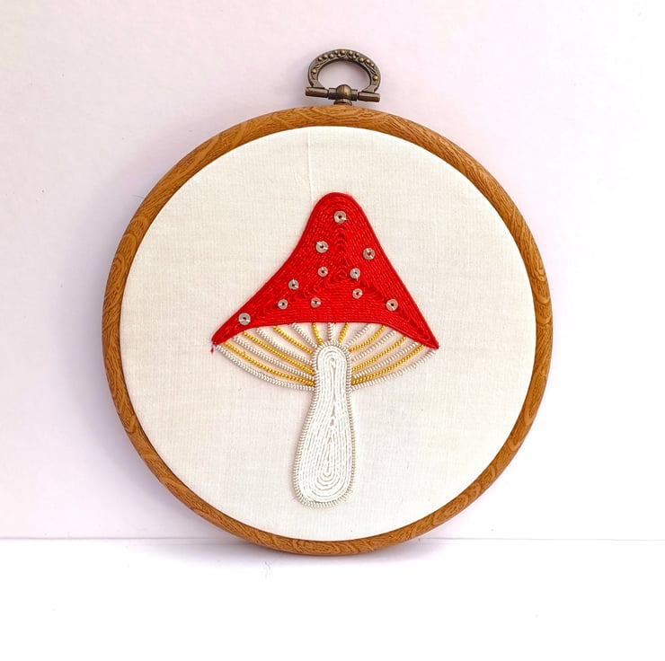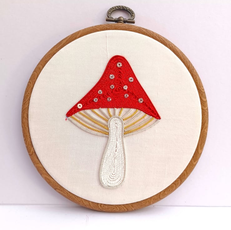 Goldwork Toadstool Embroidery Hoop, Goldwork Mushroom Embroidery Hoop, Metalthread Embroidery