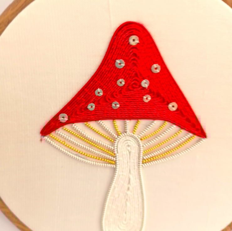 This lovely mushroomtoadstool is hand stitched using goldwork wires, threads and spangles, on to a white silk backing
