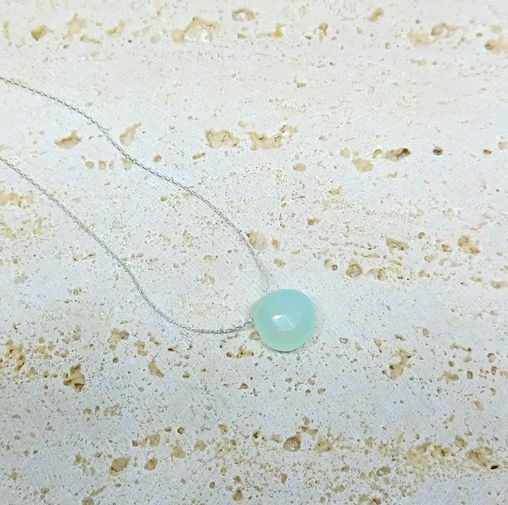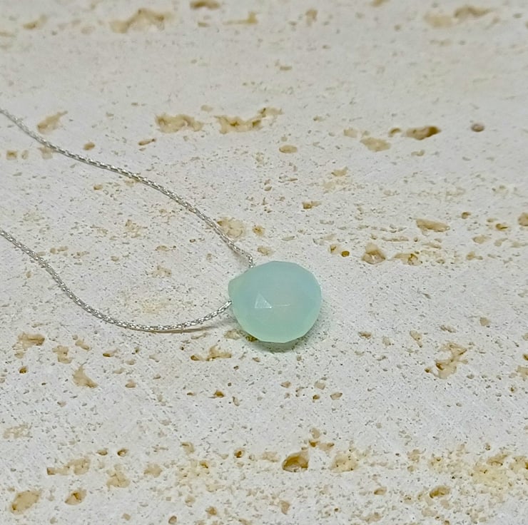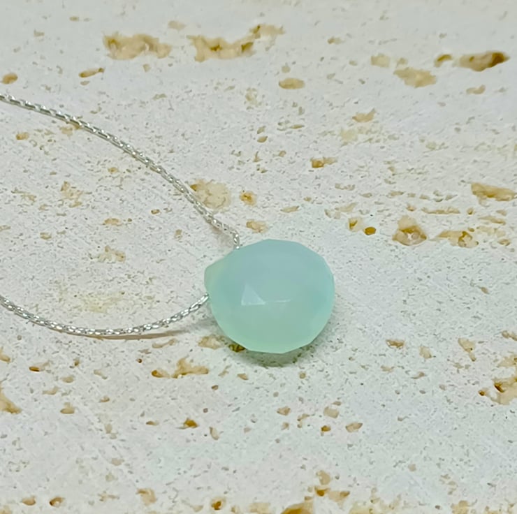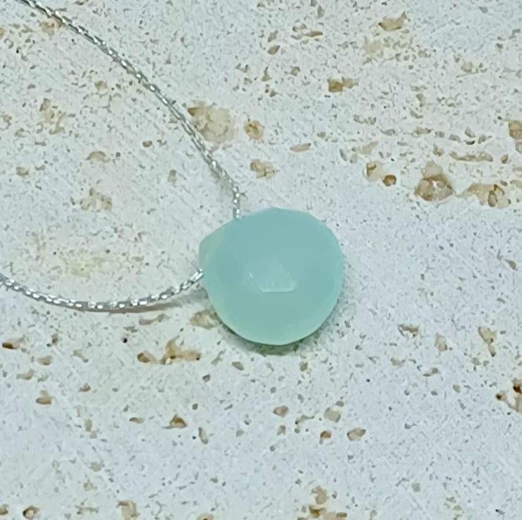 I ve been trying to work on some designs for people who prefer a lightweight necklace, and I have come up with this beautiful faceted blue chalcedony teardrop which is threaded on to a thin sterling silver beading chain. The entire necklace measures approximately 18 inches.