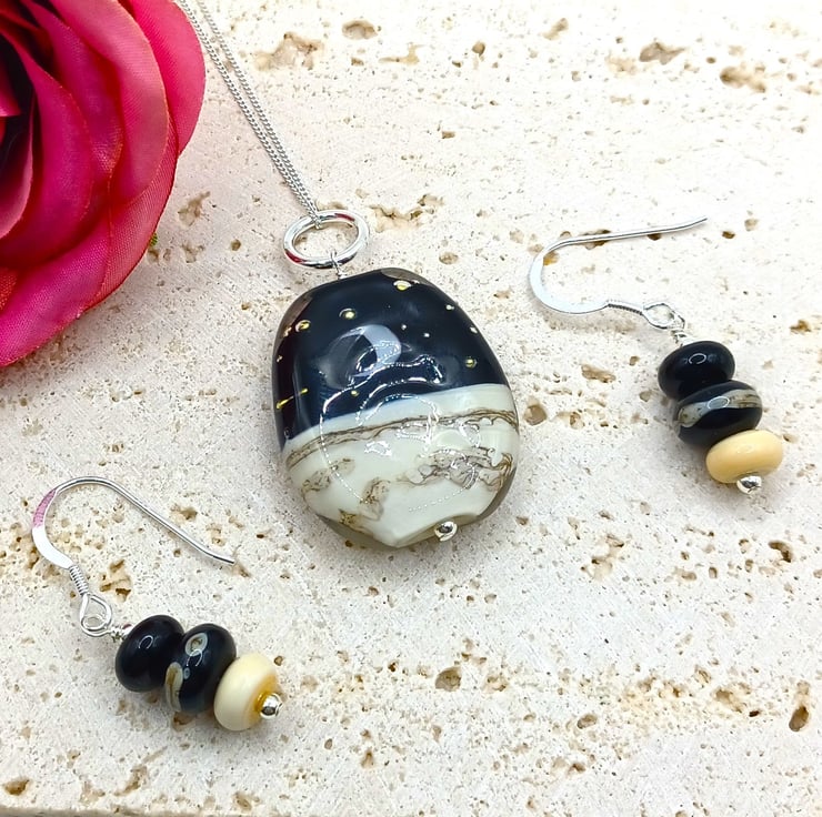 Indulge in the timeless elegance of our handmade lampwork glass moon jewellery set, meticulously crafted to add a touch of sophistication to any ensemble. This exquisite set includes a stunning pendant and matching earrings, each featuring delicate lampwork glass elements created by a fabulous UK based glass artist. The intricate details of the lampwork is complemented by sterling silver findings, ensuring durability and a refined finish.