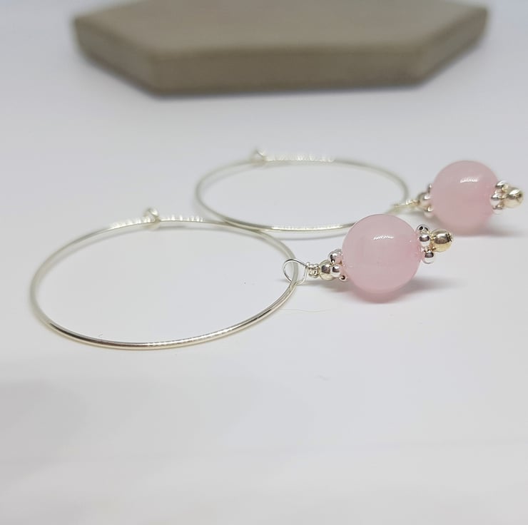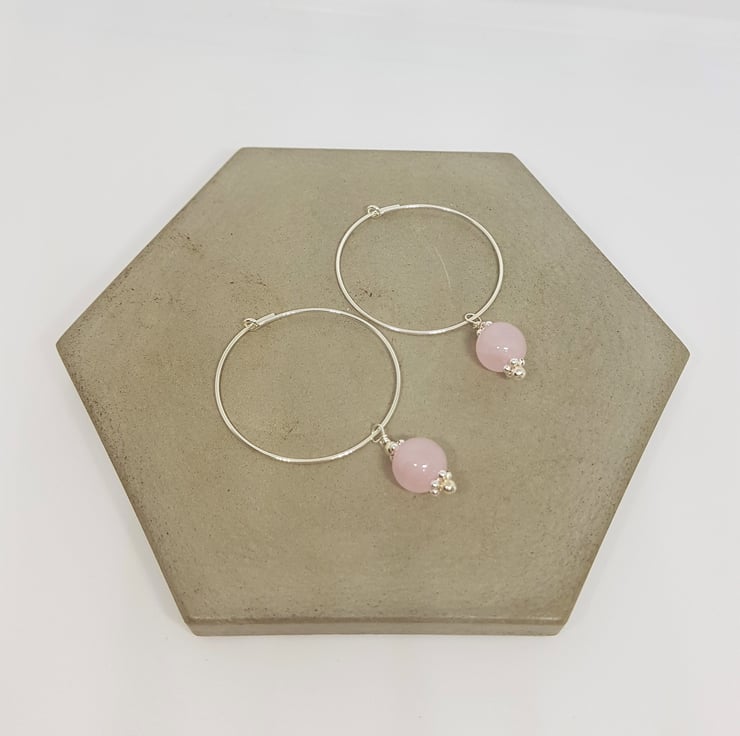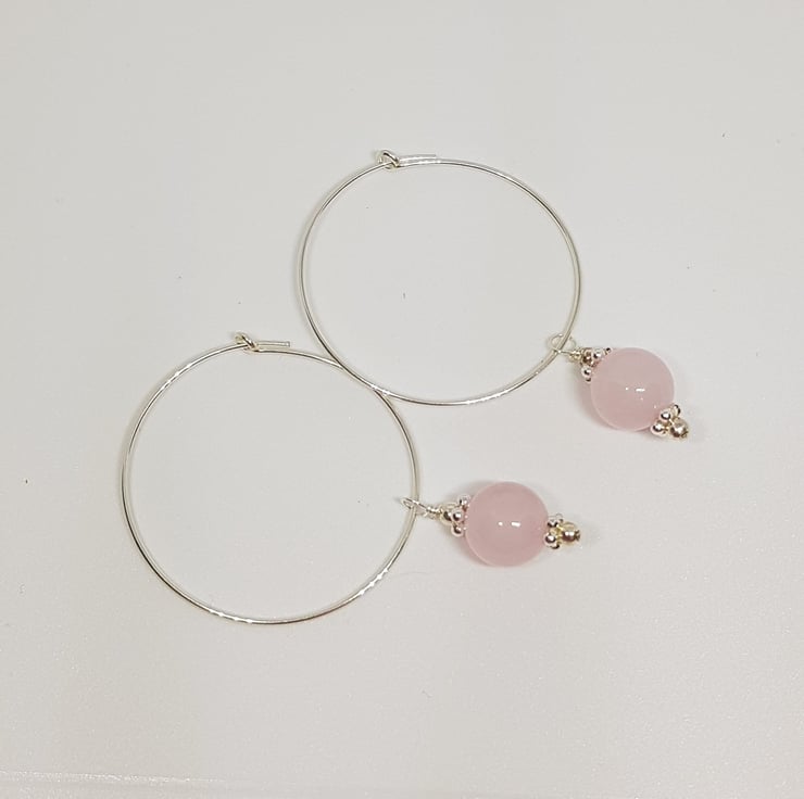These 8mm Rose Quartz beads are surrounded by sterling silver flower beads, and they hang from a sterling silver hoop.