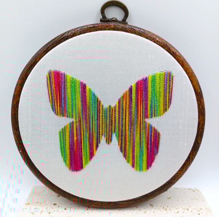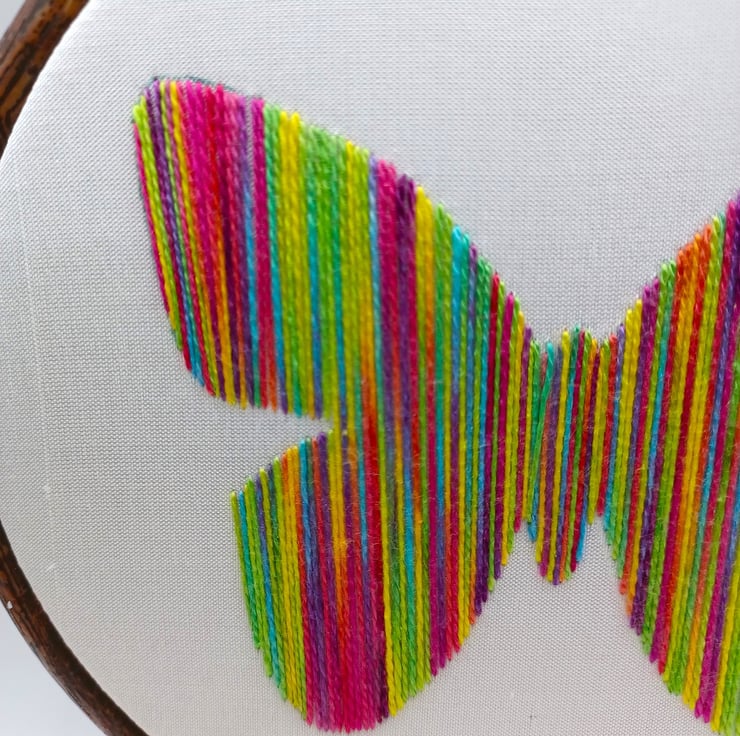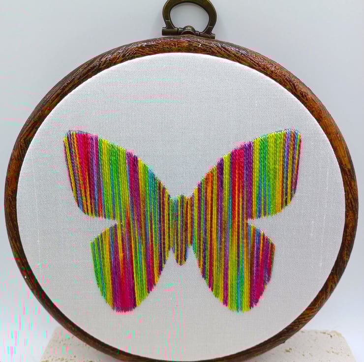 Completely hand embroidered on to silk and framed in a 5 inch hoop, which is backed with felt for protection. The hoop has an integral hanger, so it arrives ready to pop on your wall. I have other rainbow designs available - see the photos (not included in this item)